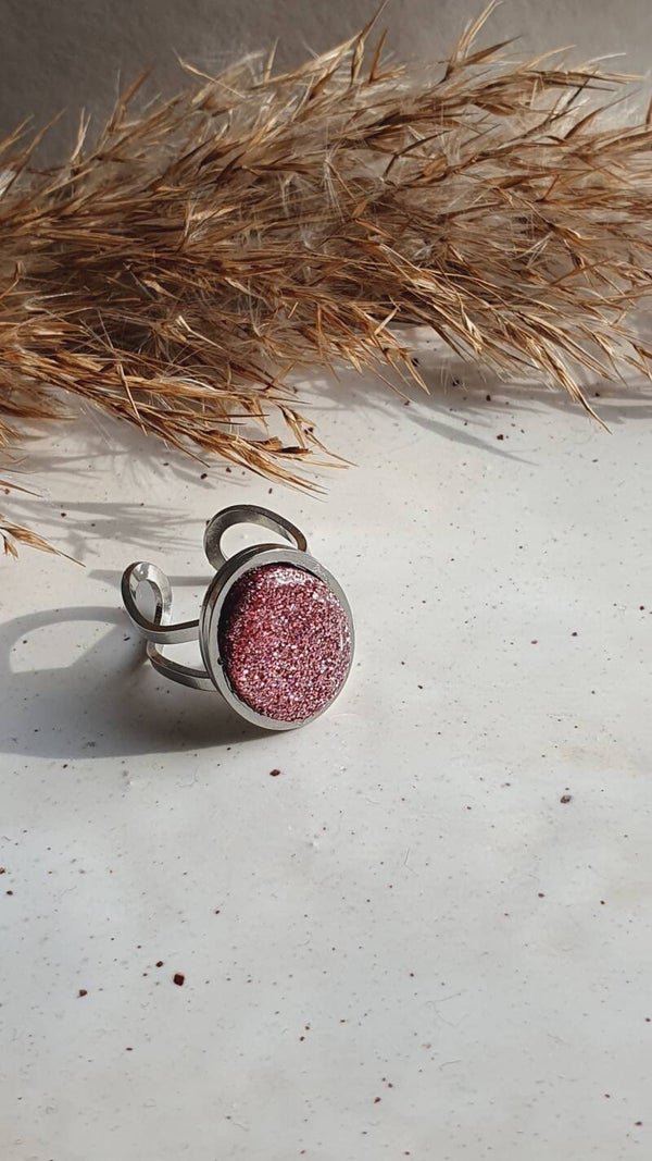 De ring is opgevuld met polymeerklei en glitters, met daar overheen een resin glanslaag. Superleuk te combineren met bijpassende oorbellen en/of ketting (zie laatste foto).