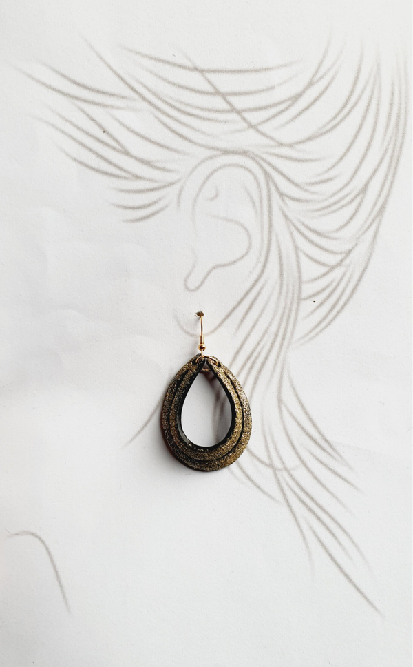 Echt een eyecatcher en zo mooi door de wijze waarop de klei gebogen en samengevoegd is door het buigringetje. De zwarte polymeerklei is voorzien van goudglitters en met glanslak afgelakt.
