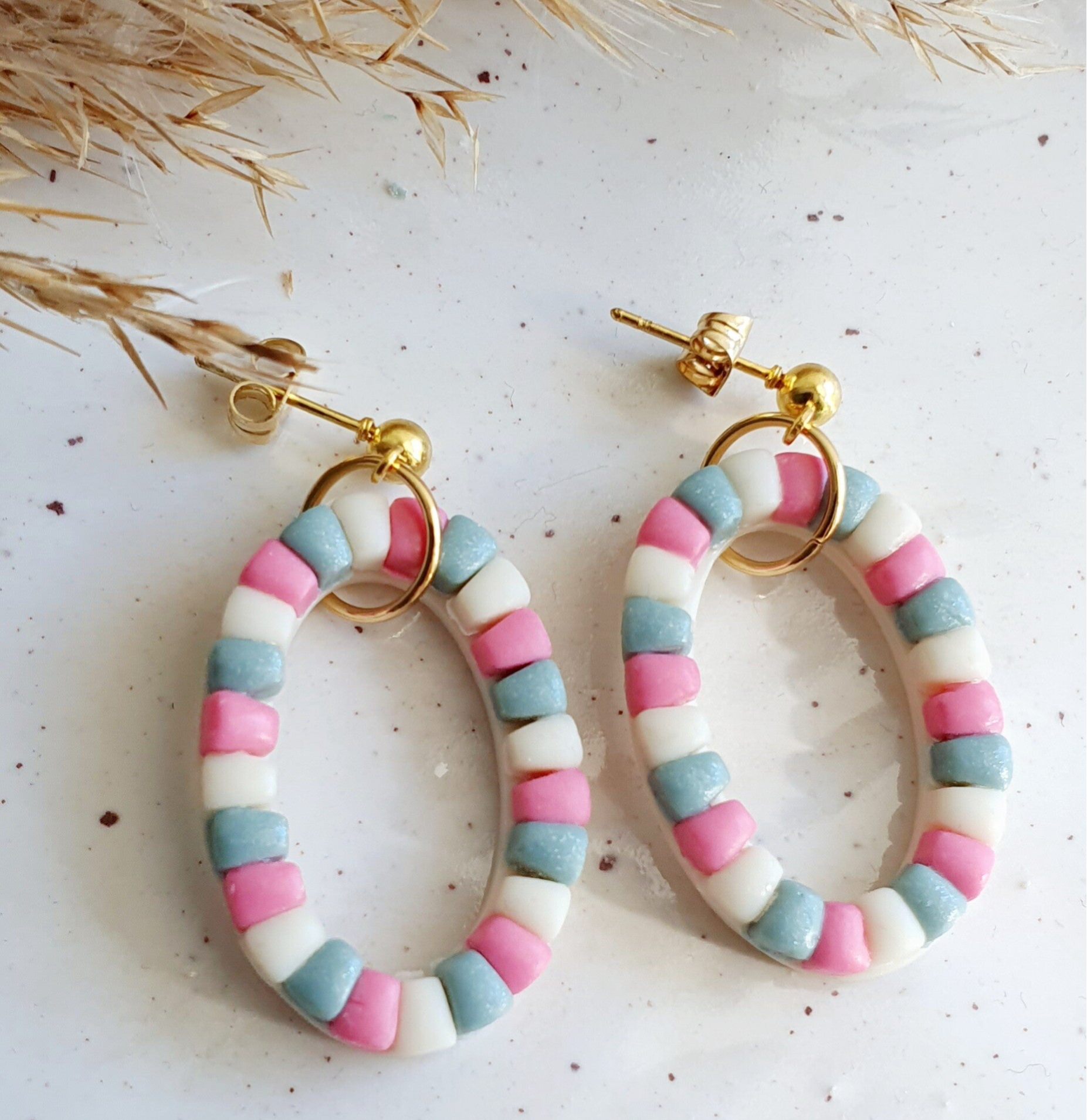Een vrolijk model in verschillende tinten en een goudkleurig knopje. De polymeerklei is met glanslak afgelakt.
