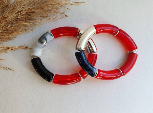 Dieprode kleur gecombineerd met zwart en zilver. Ook in een andere variant verkrijgbaar (zie foto 2).
