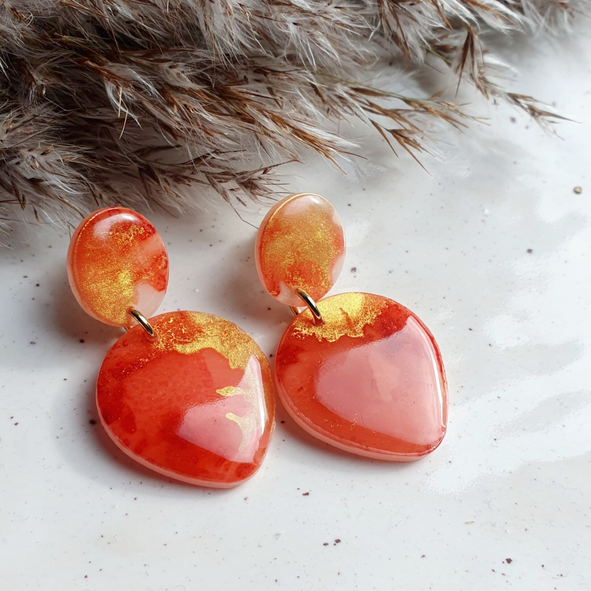 Uniek gemengd. Bruingeel,roze en goude alcolholinkt op iets lichtdoorlatende polymeerklei en afgewerkt met resin. Door de lichtval krijg je telkens op een andere kleur het accent, echt heel tof!