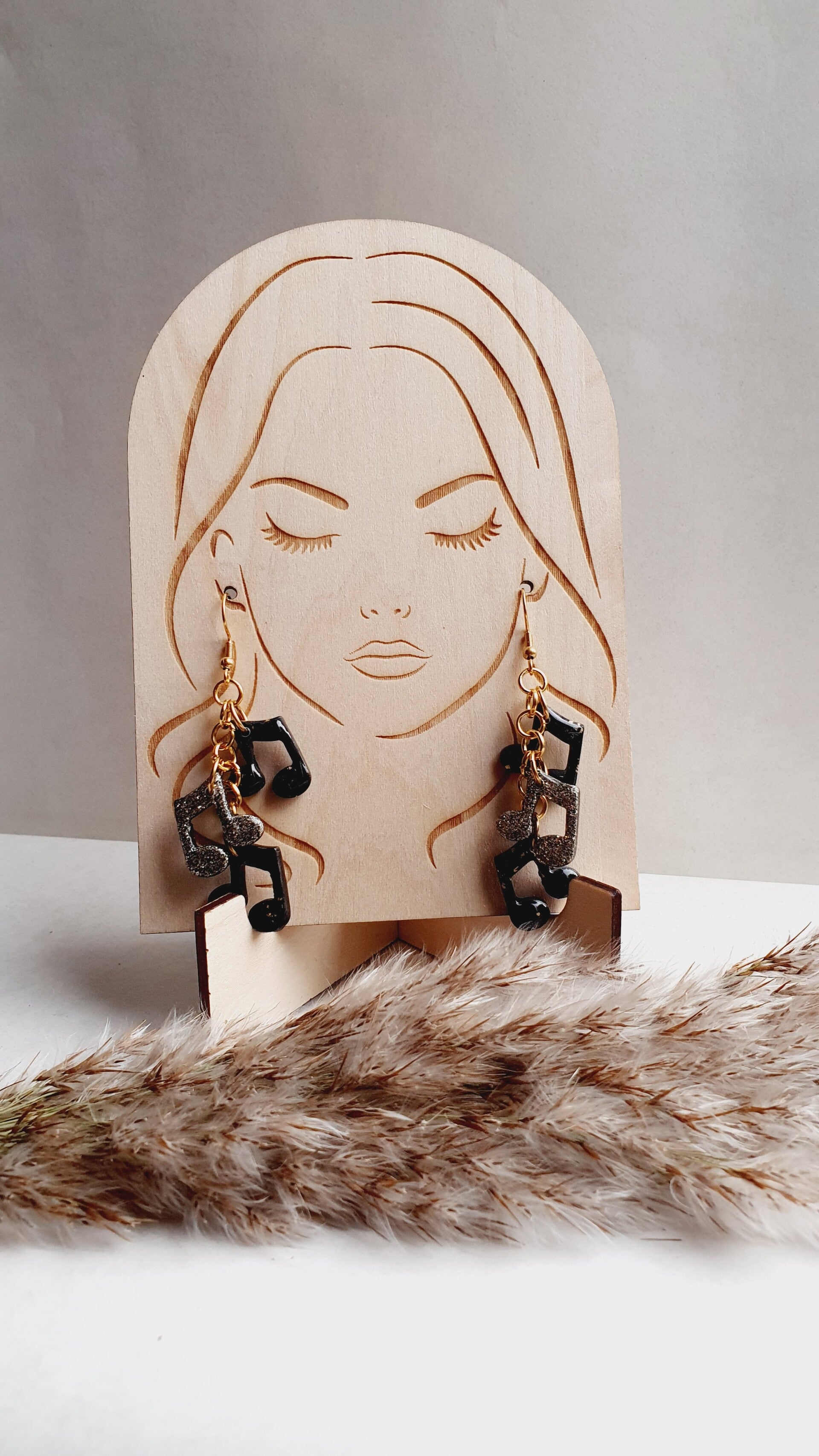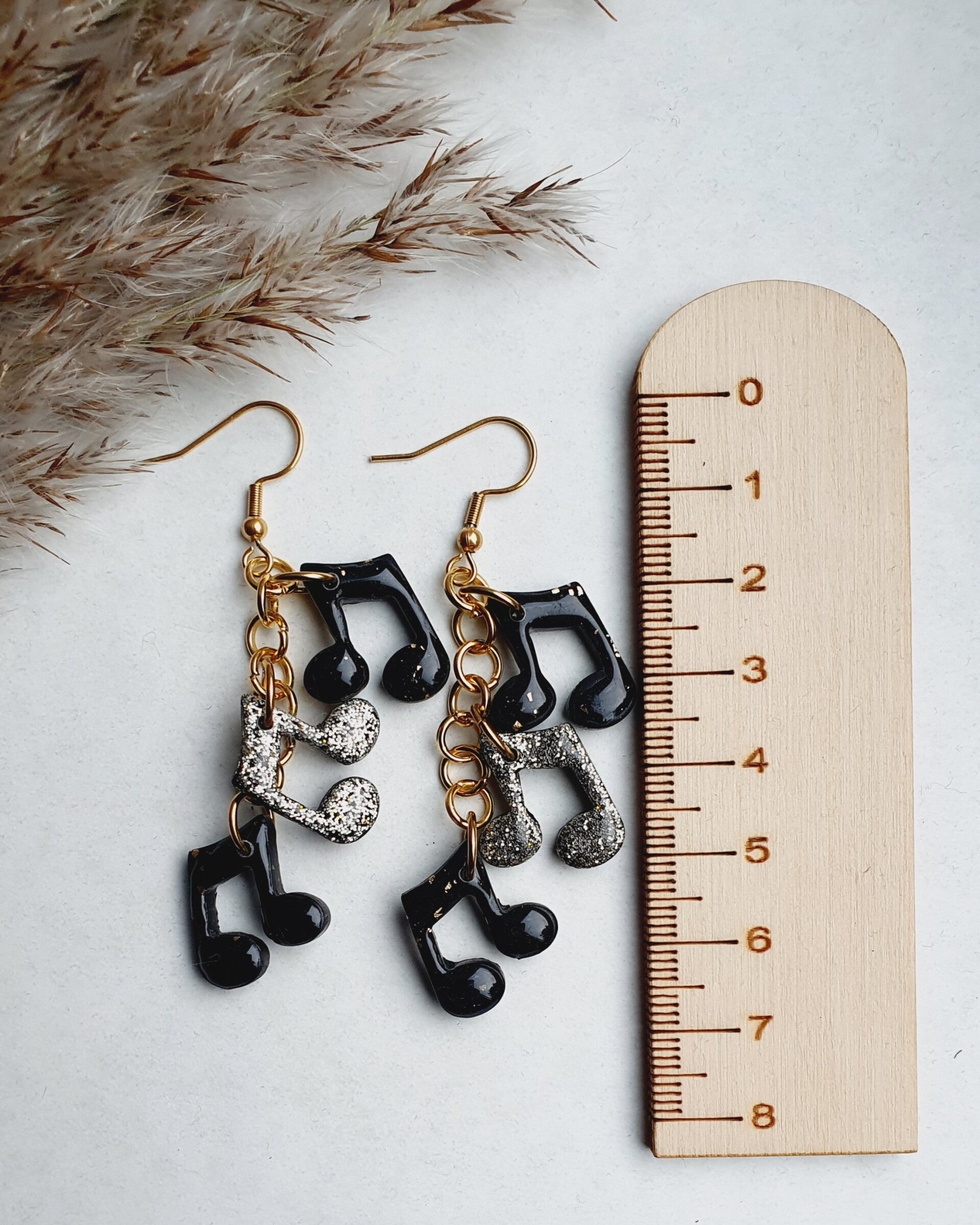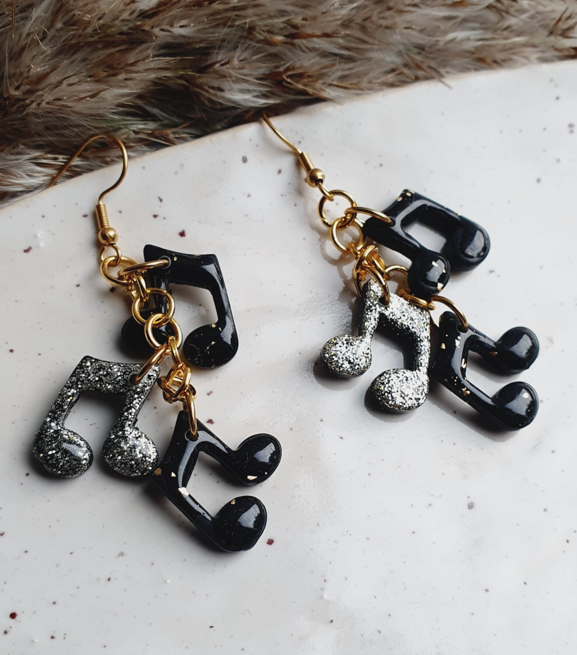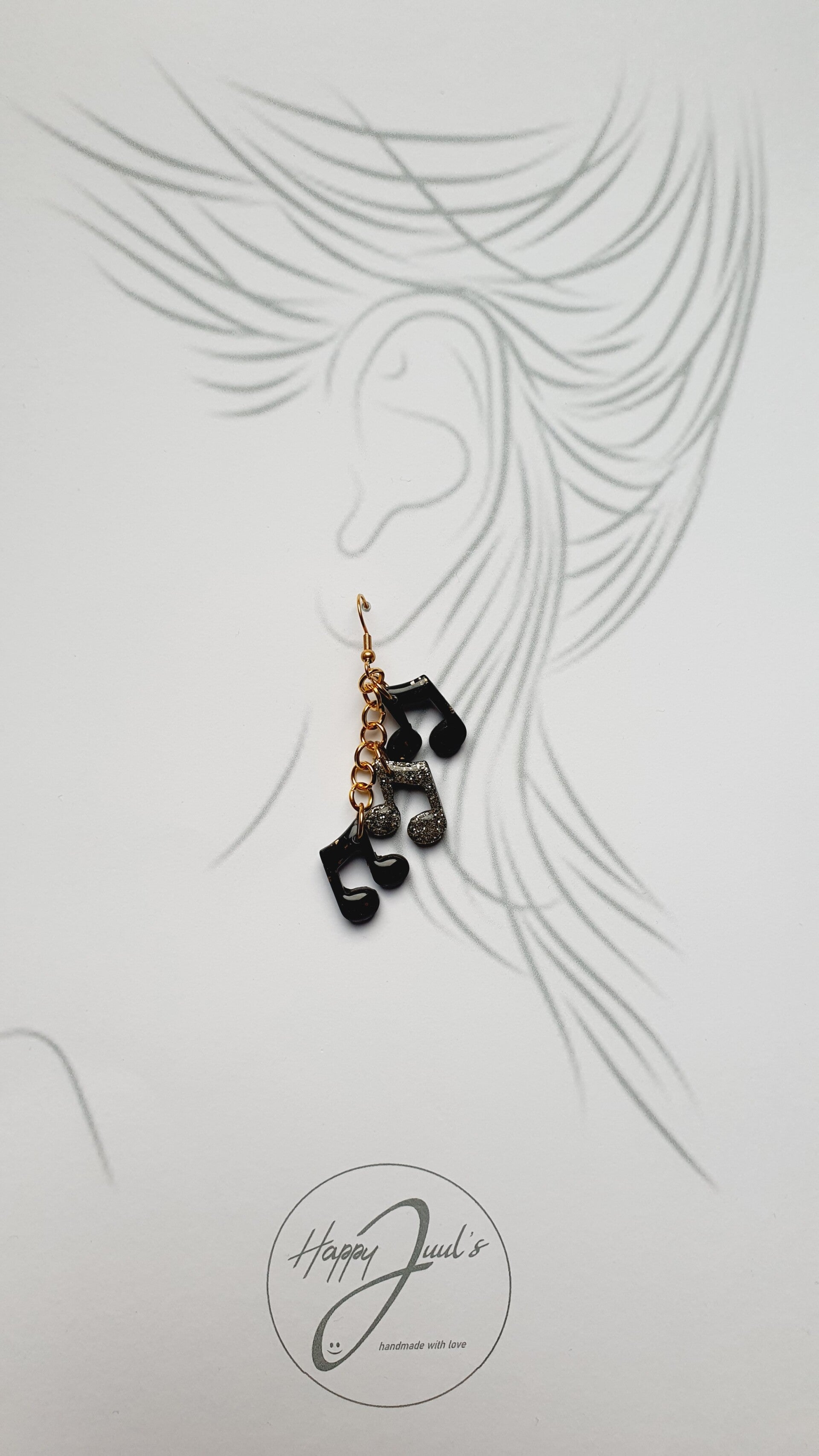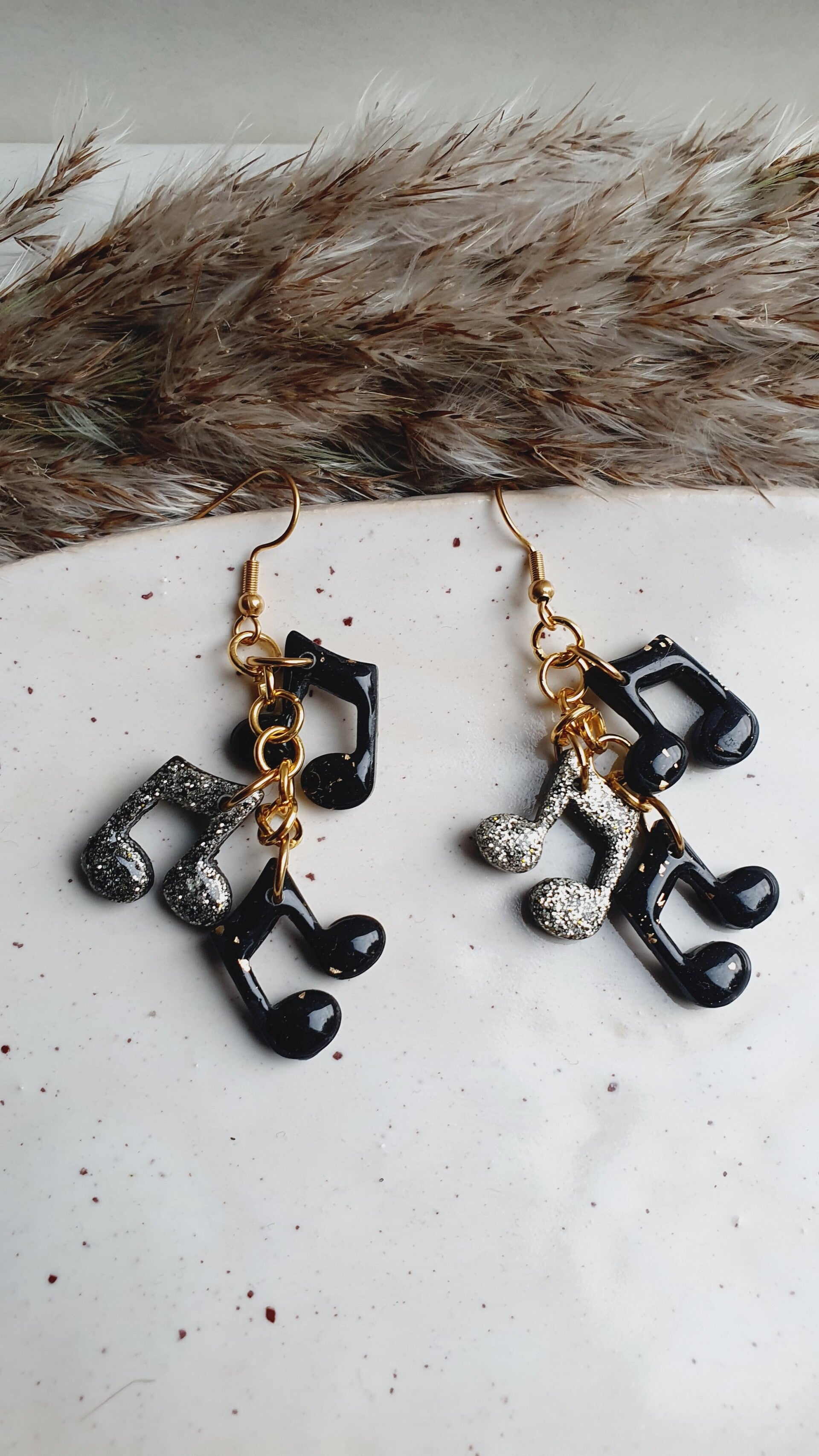 Echte eyecatchers waar je niet omheen kunt. Aan elke oorbel 3 muzieknootjes, waarbij er één voorzien is van goudglitters (al is deze kleur niet geelgoud). En de twee andere zwart met subtiel wat goudfolie. Alle muzieknootjes zijn voorzien van een extra resin glanslaag (aan beide zijden!).