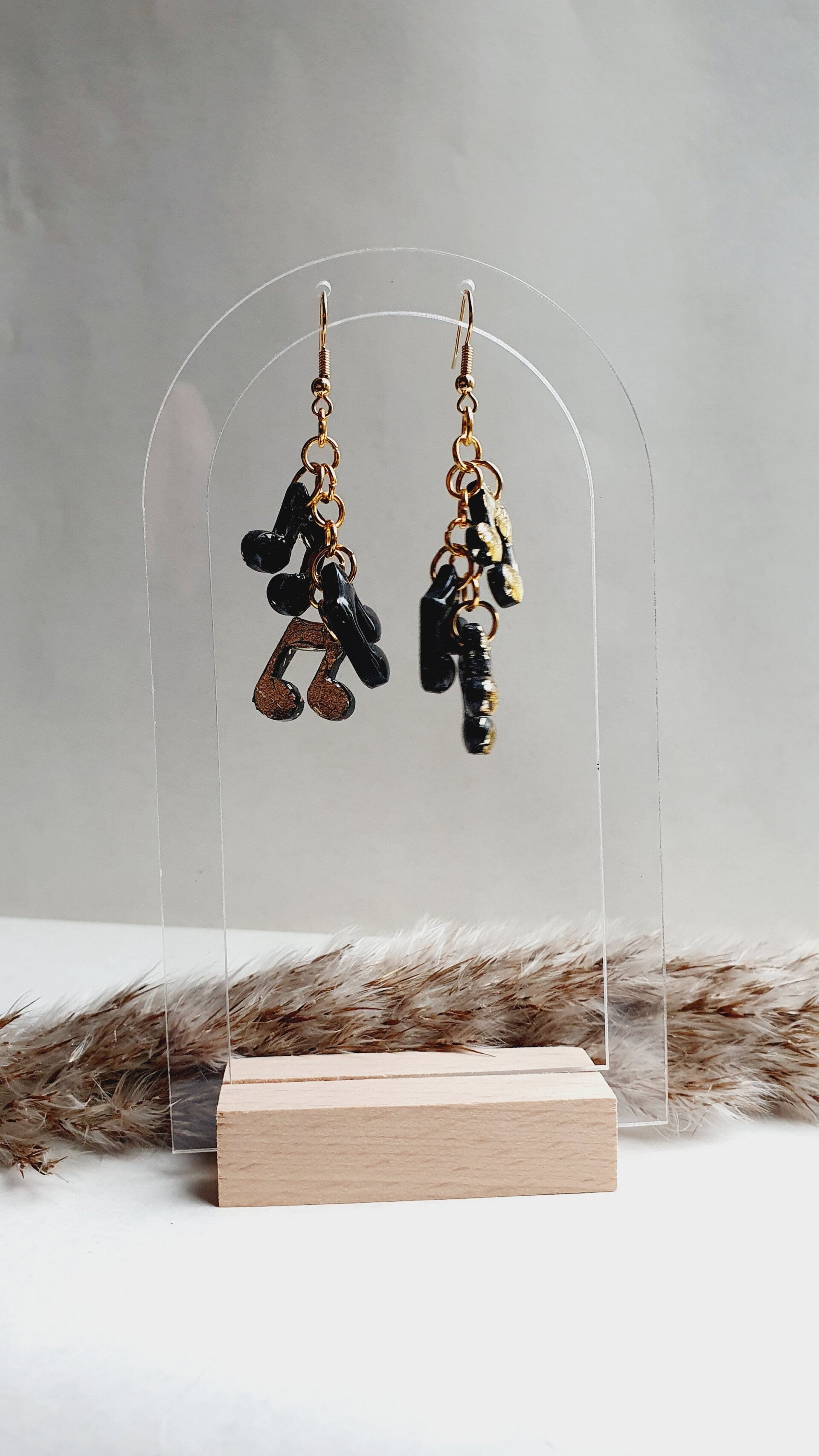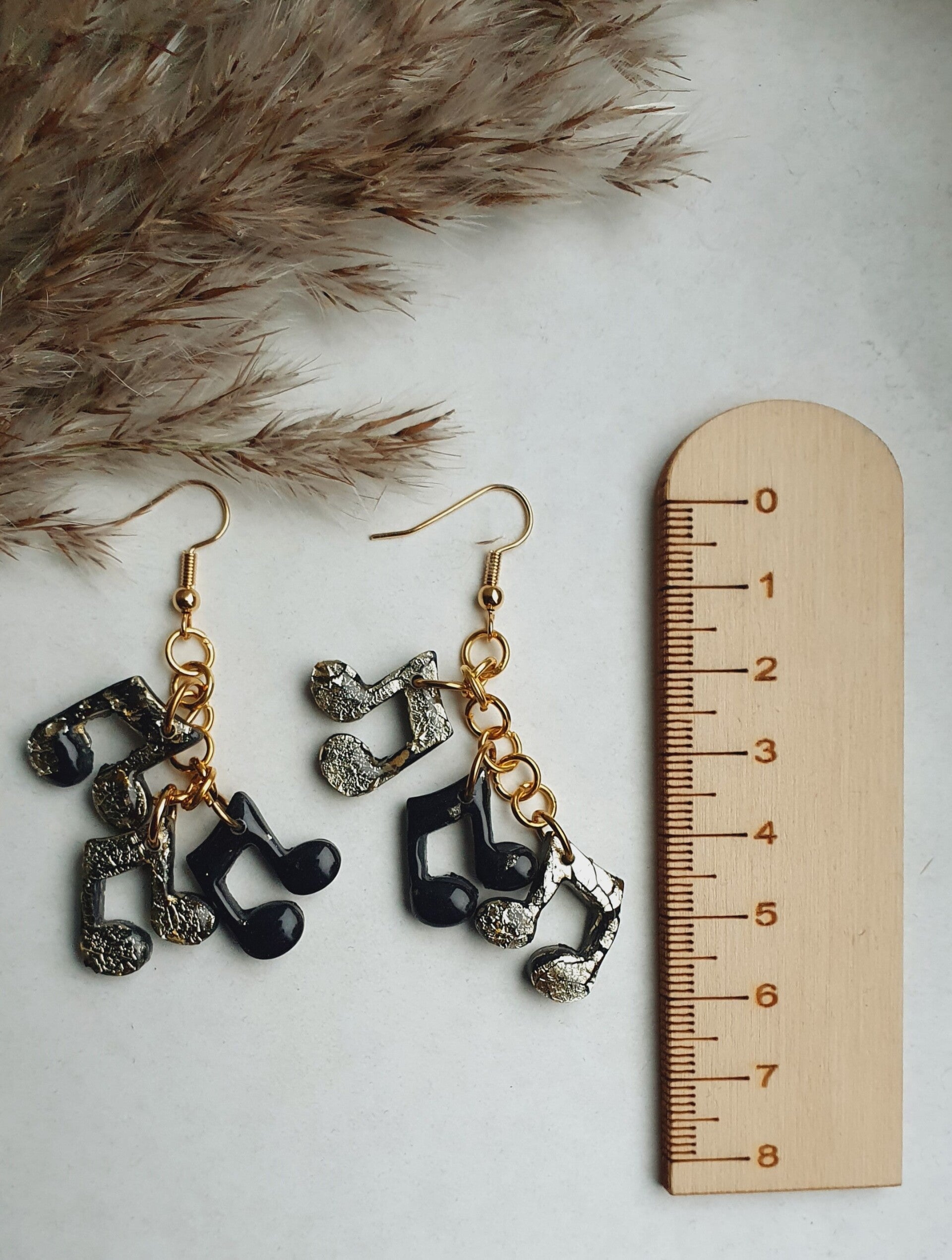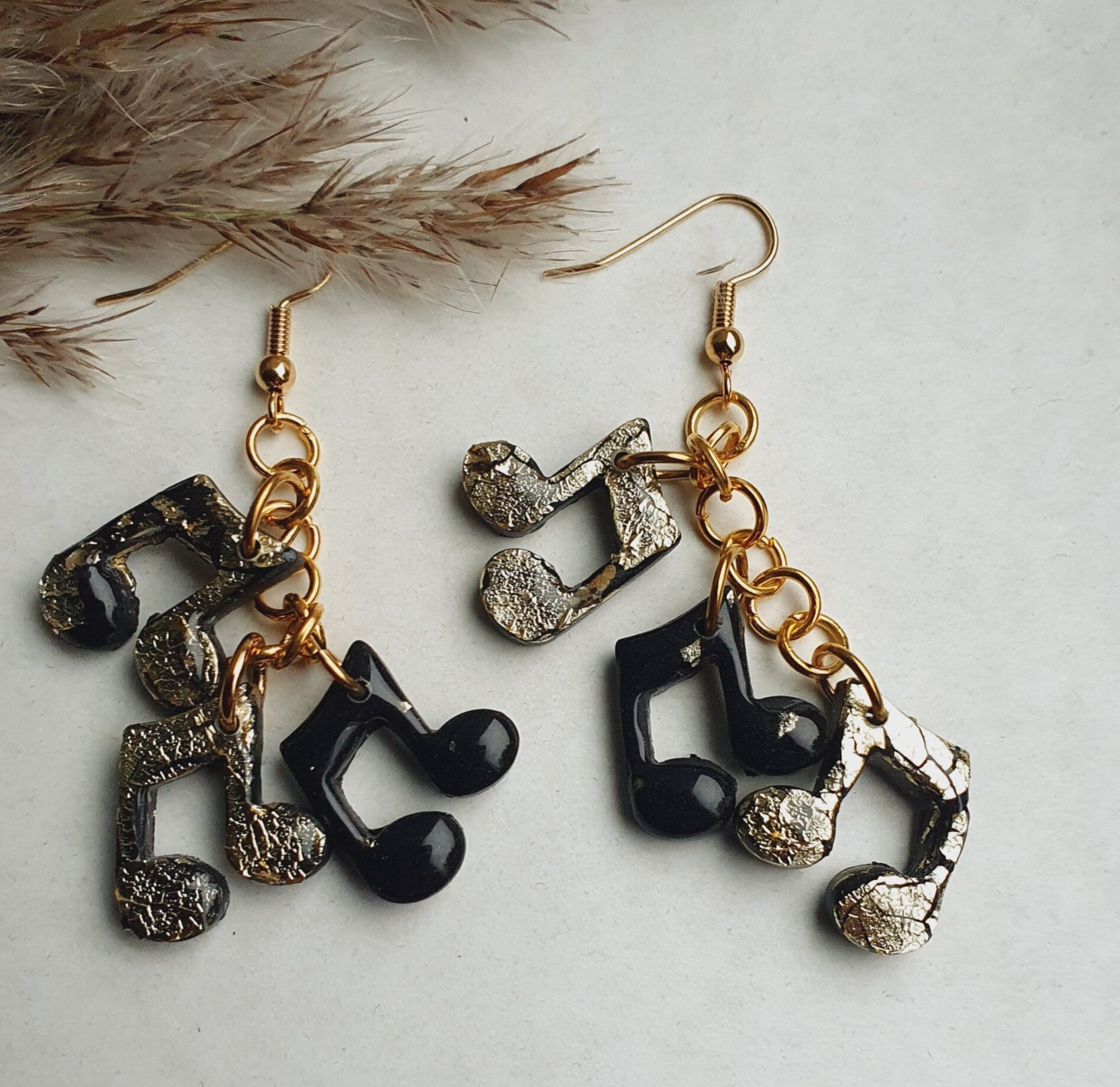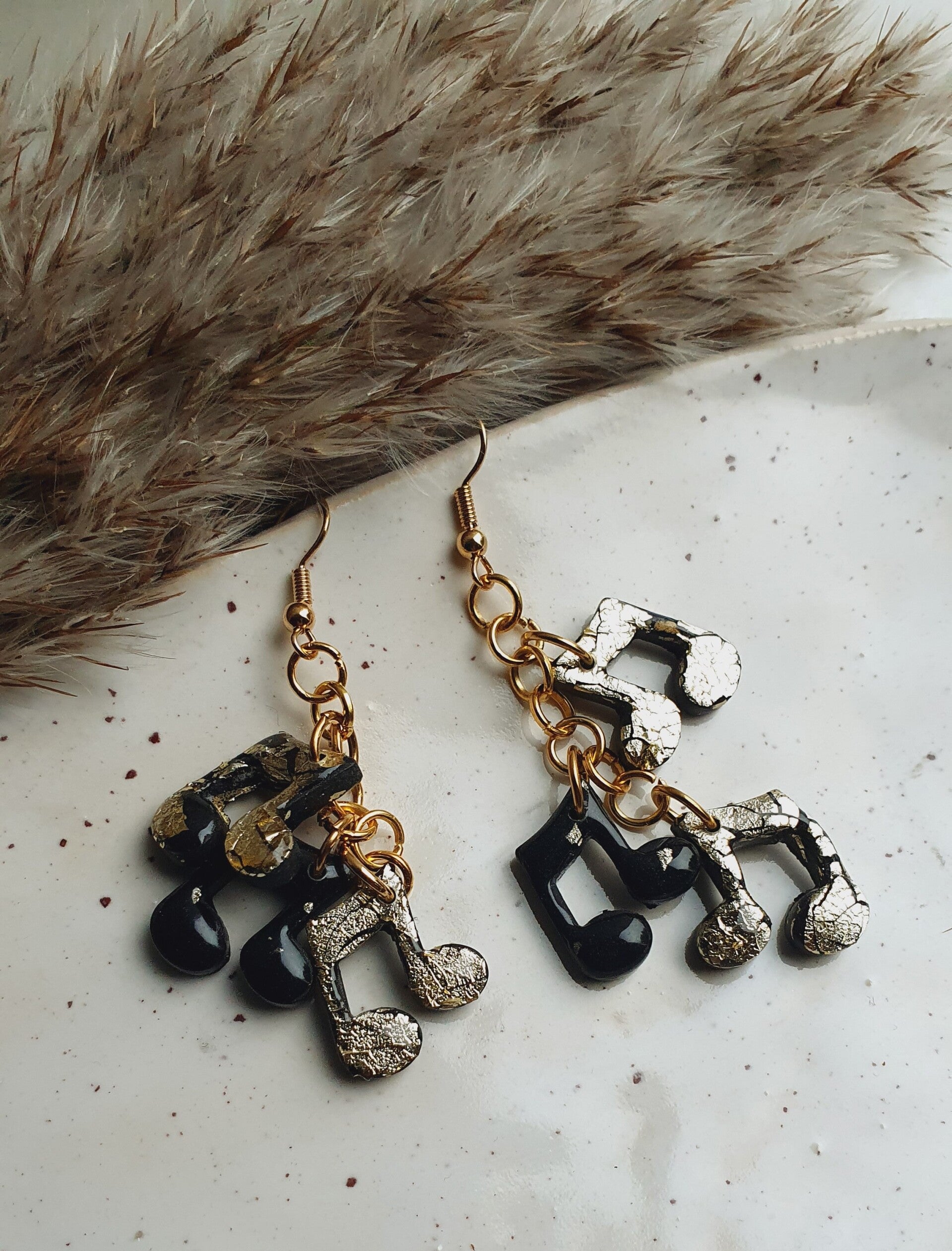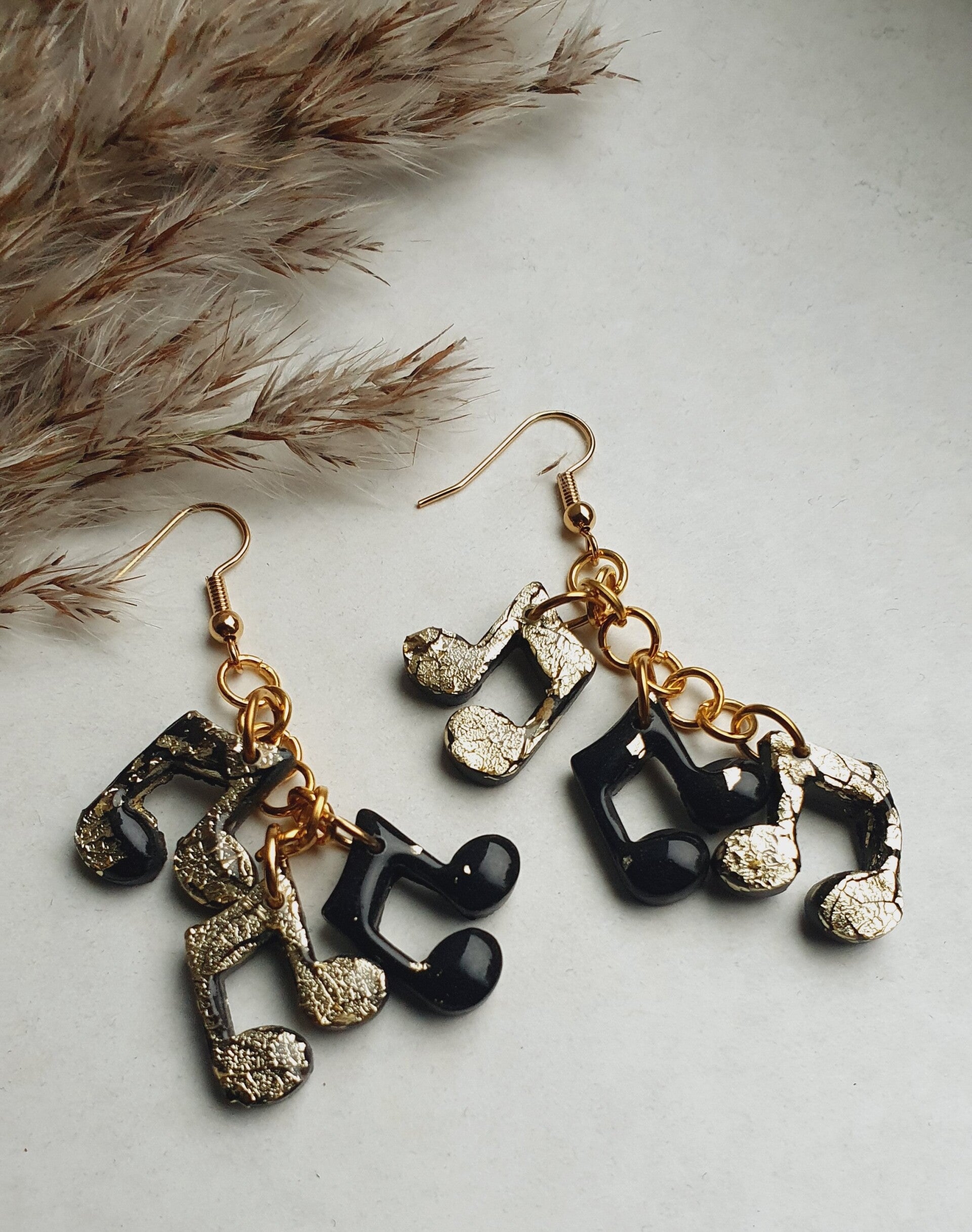 Echte eyecatchers waar je niet omheen kunt. Aan elke oorbel 3 muzieknootjes, waarbij er één voorzien is van wat subtiel goudfolie door de polymeerklei verwerkt. En de twee andere zwart met goudfolie bedekt zijn. Hierbij wel de aantekening dat dit er niet strakgoud uitziet en ik de kleur bij sommigen wat bijgewerkt heb met goudstift (zie details laatste foto).