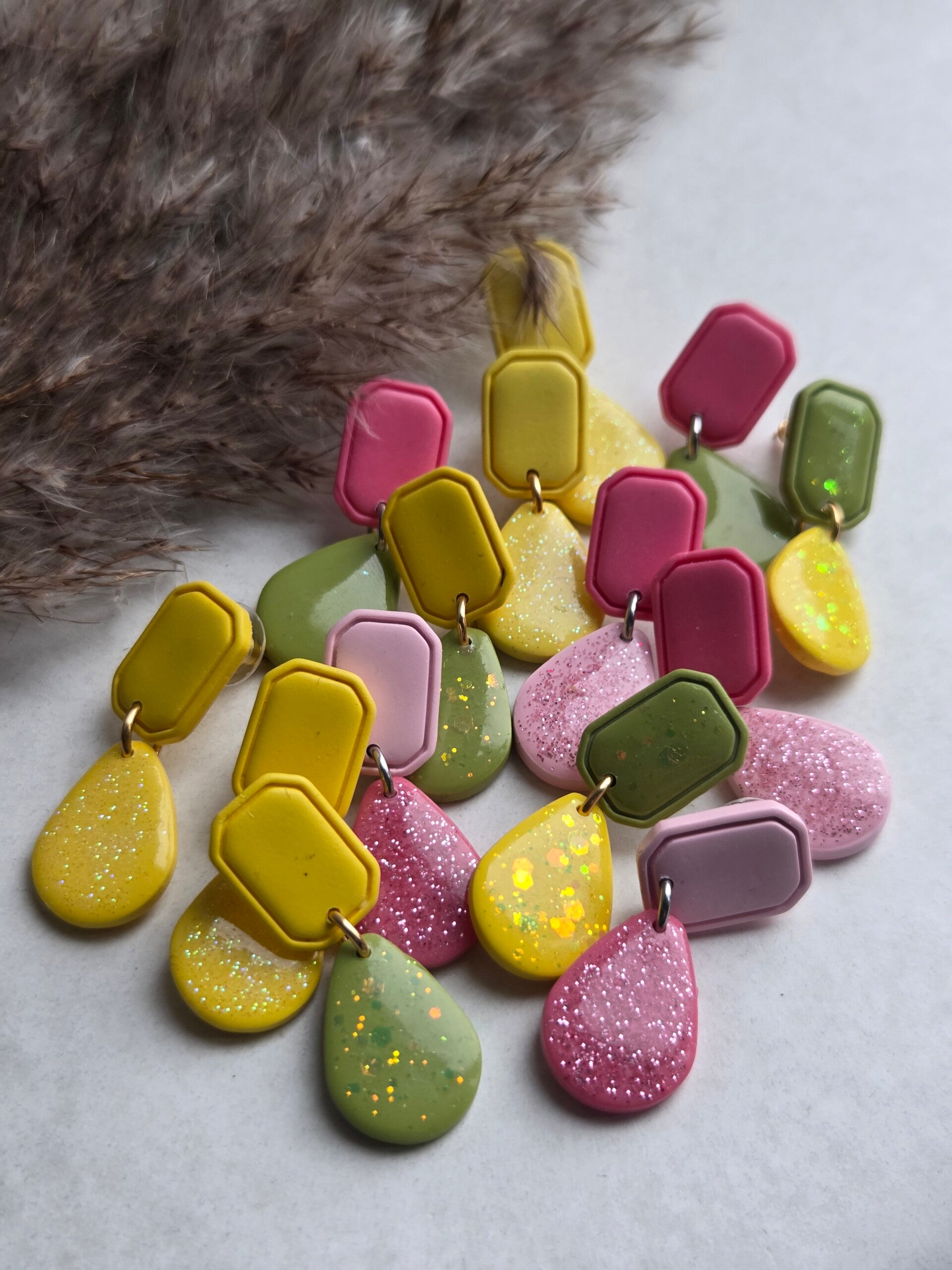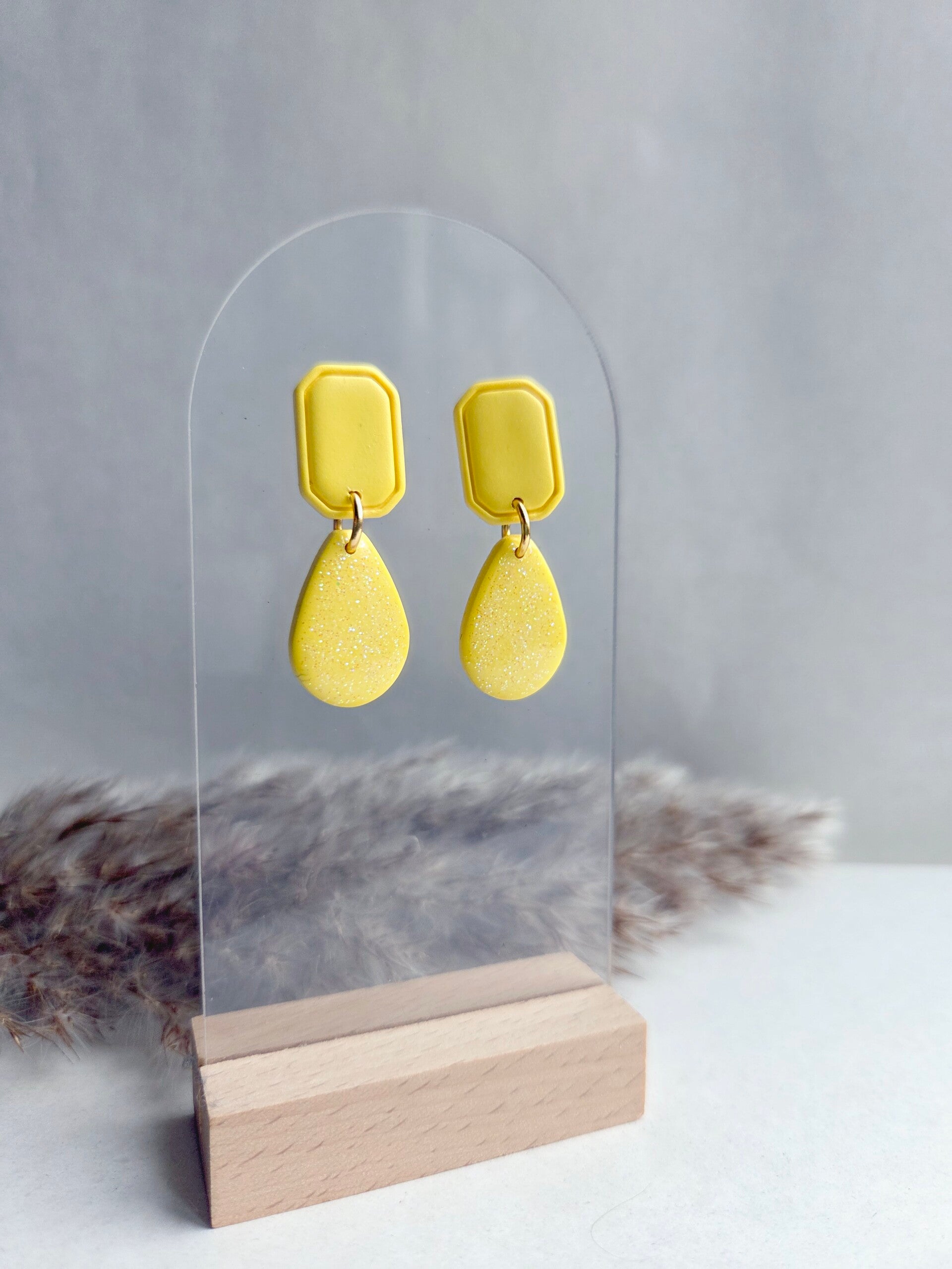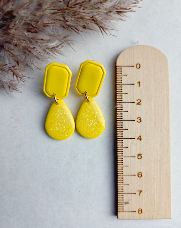De trendkleur van dit moment; geel. Een wat kleiner model, maar tegelijk heel elegant en stoer. De matgelakte bovenkant steekt leuk af tegen de subtiele glitter en resin van de onderste bedel. De oorbellen zijn gemaakt van polymeerklei en wegen zo goed als niets.
