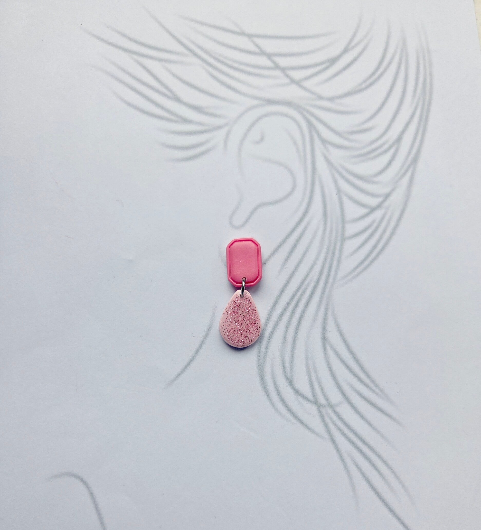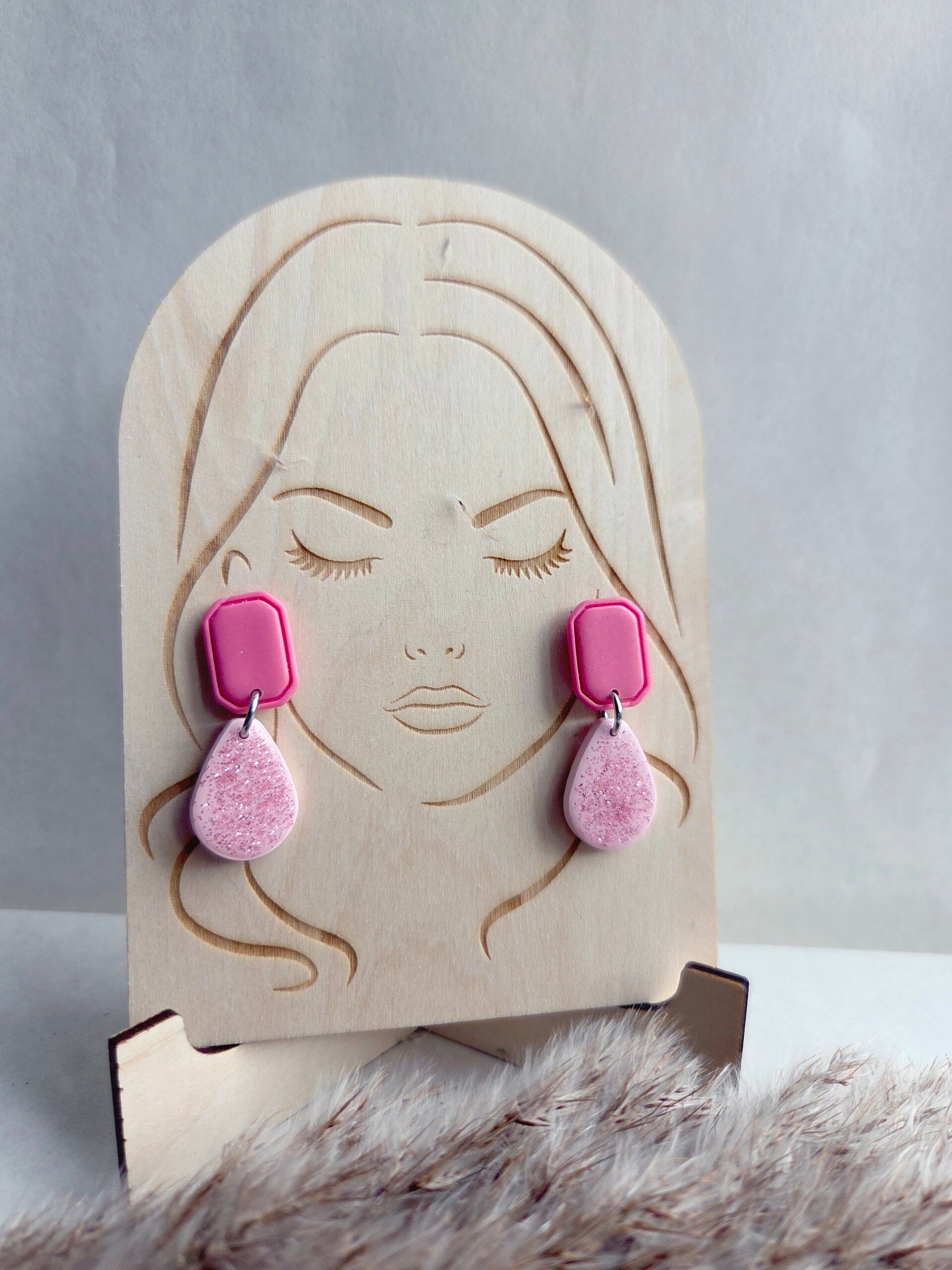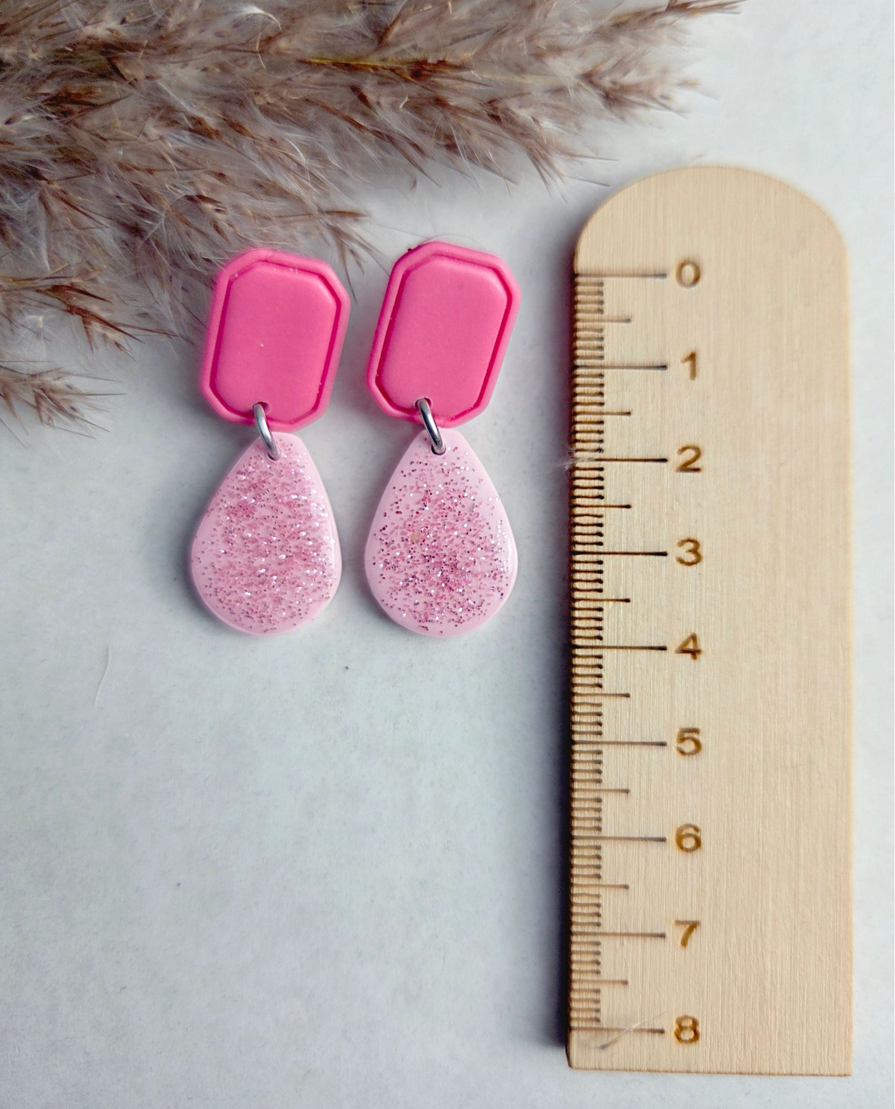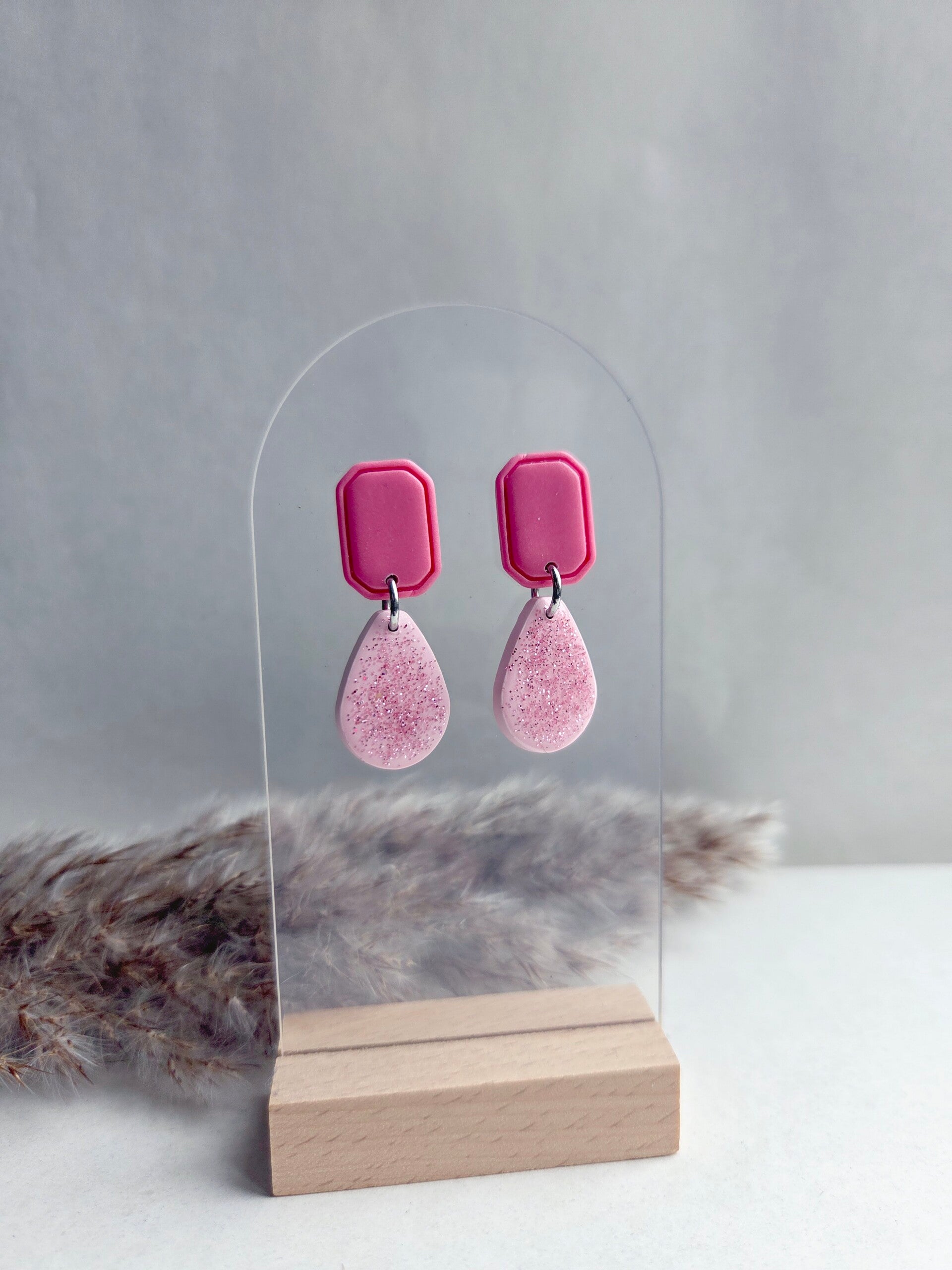 De trendkleur van dit moment; donkerroze, gecombineerd met zachtroze. Een wat kleiner model, maar tegelijk heel elegant en stoer. De matgelakte bovenkant steekt leuk af tegen de subtiele glitter en resin van de onderste bedel. De oorbellen zijn gemaakt van polymeerklei en wegen zo goed als niets.