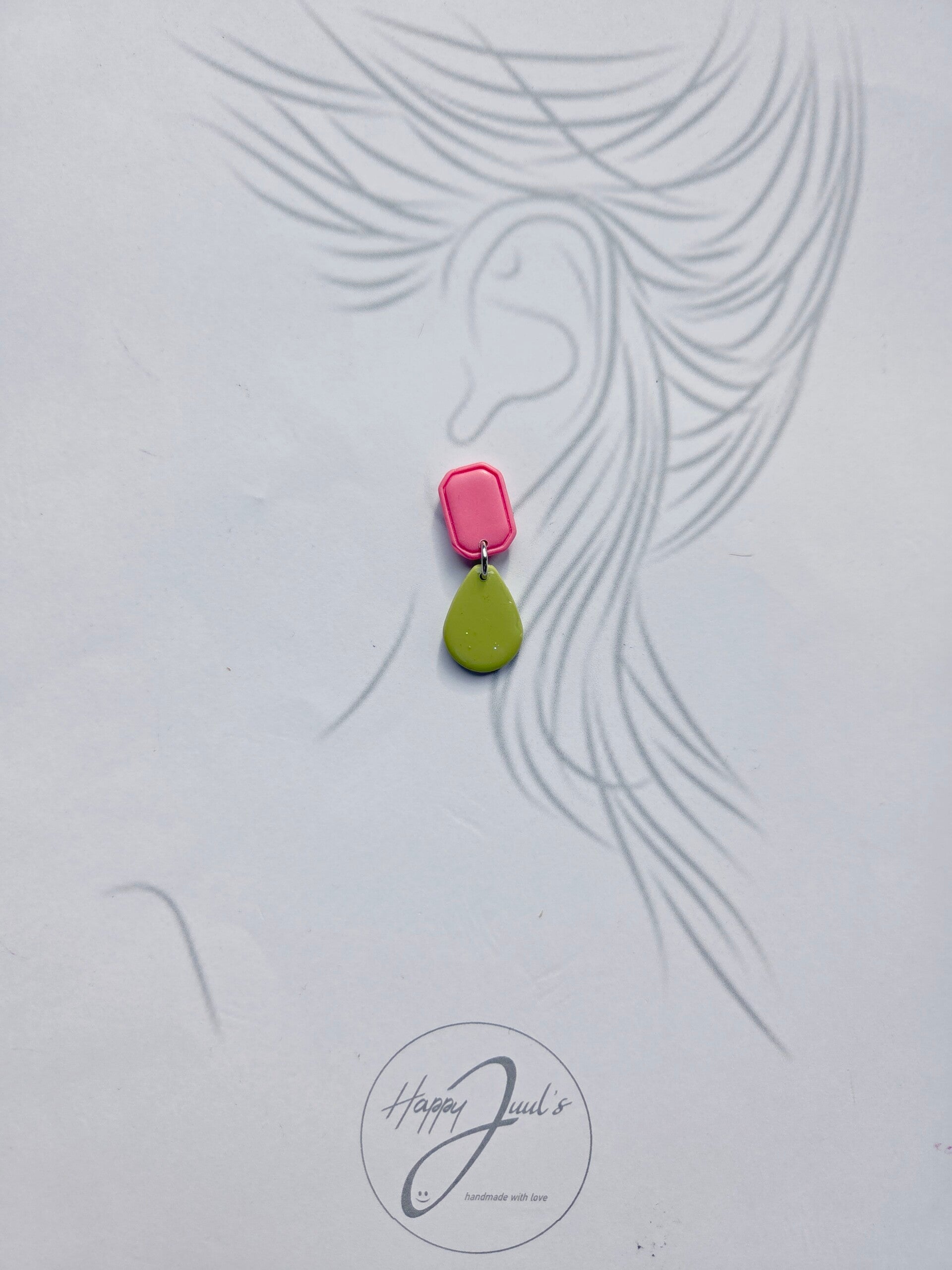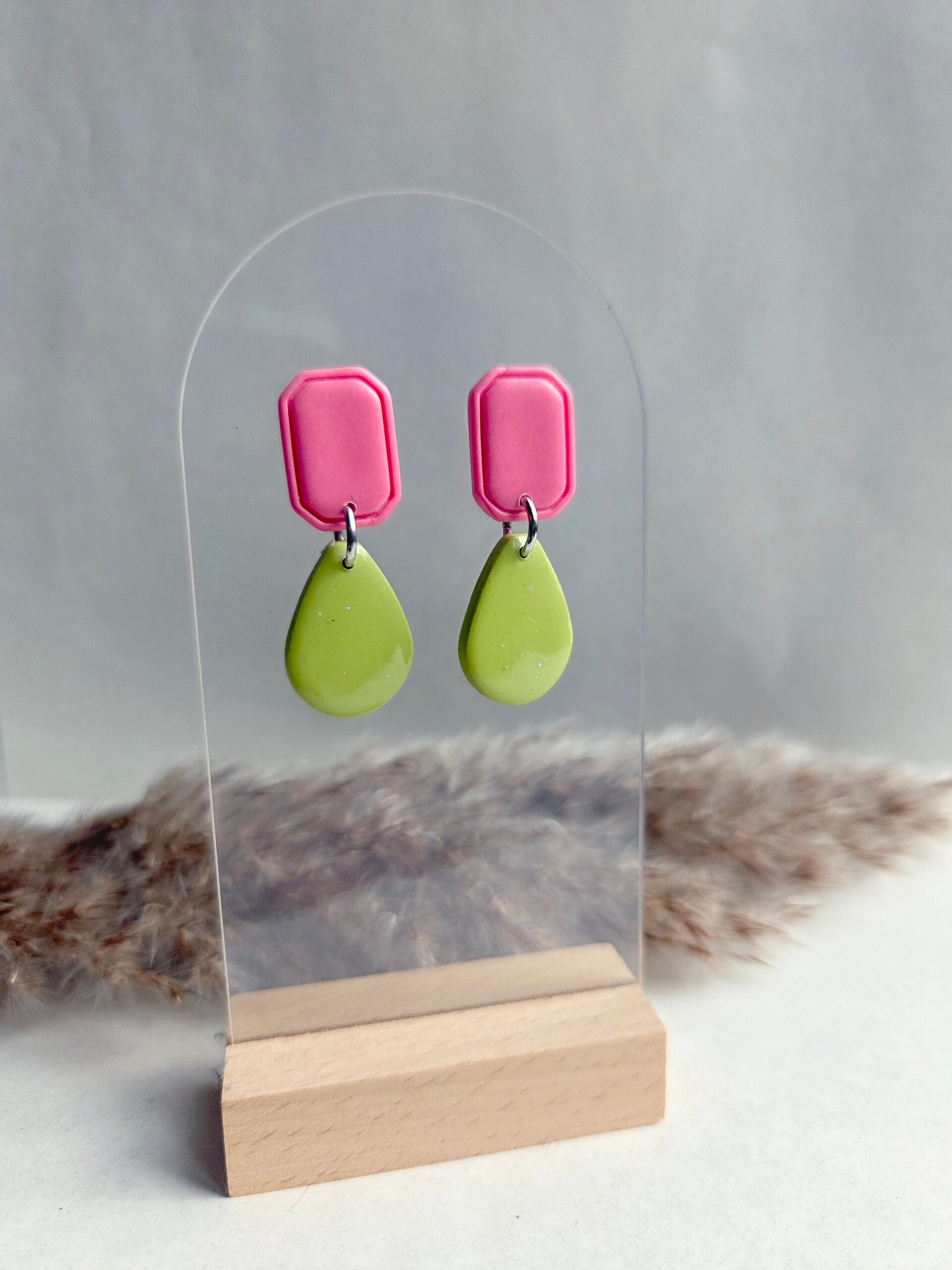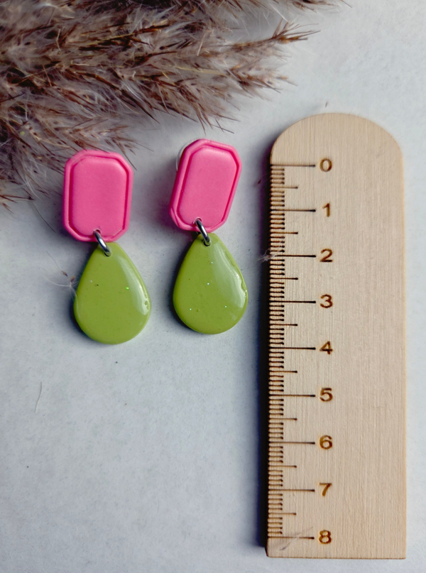 De trendkleur van dit moment; donkerroze, gecombineerd met een zacht olijfgroene kleur. Een wat kleiner model, maar tegelijk heel elegant en stoer. De matgelakte bovenkant steekt leuk af tegen de resin van de onderste bedel. De oorbellen zijn gemaakt van polymeerklei en wegen zo goed als niets.