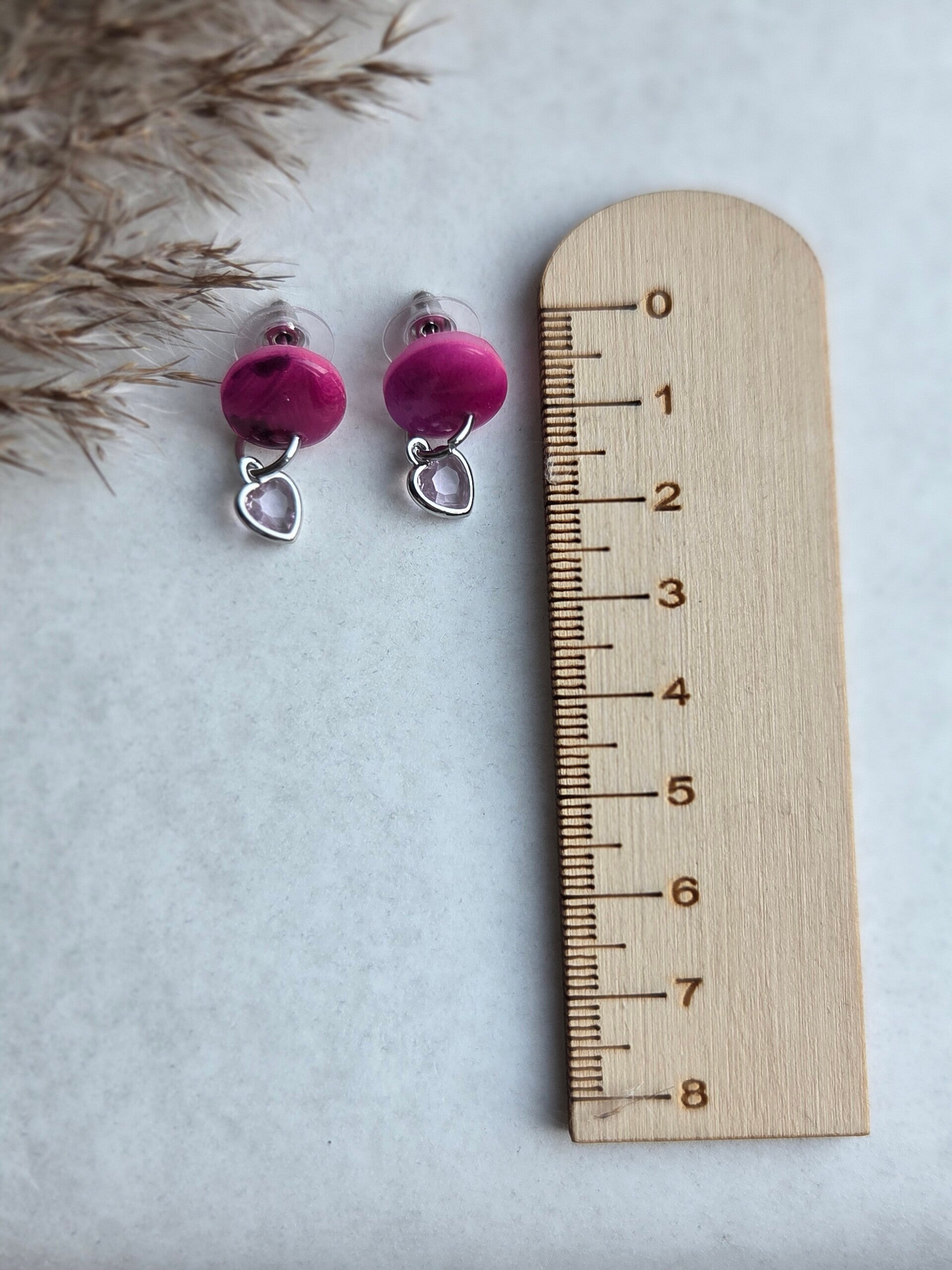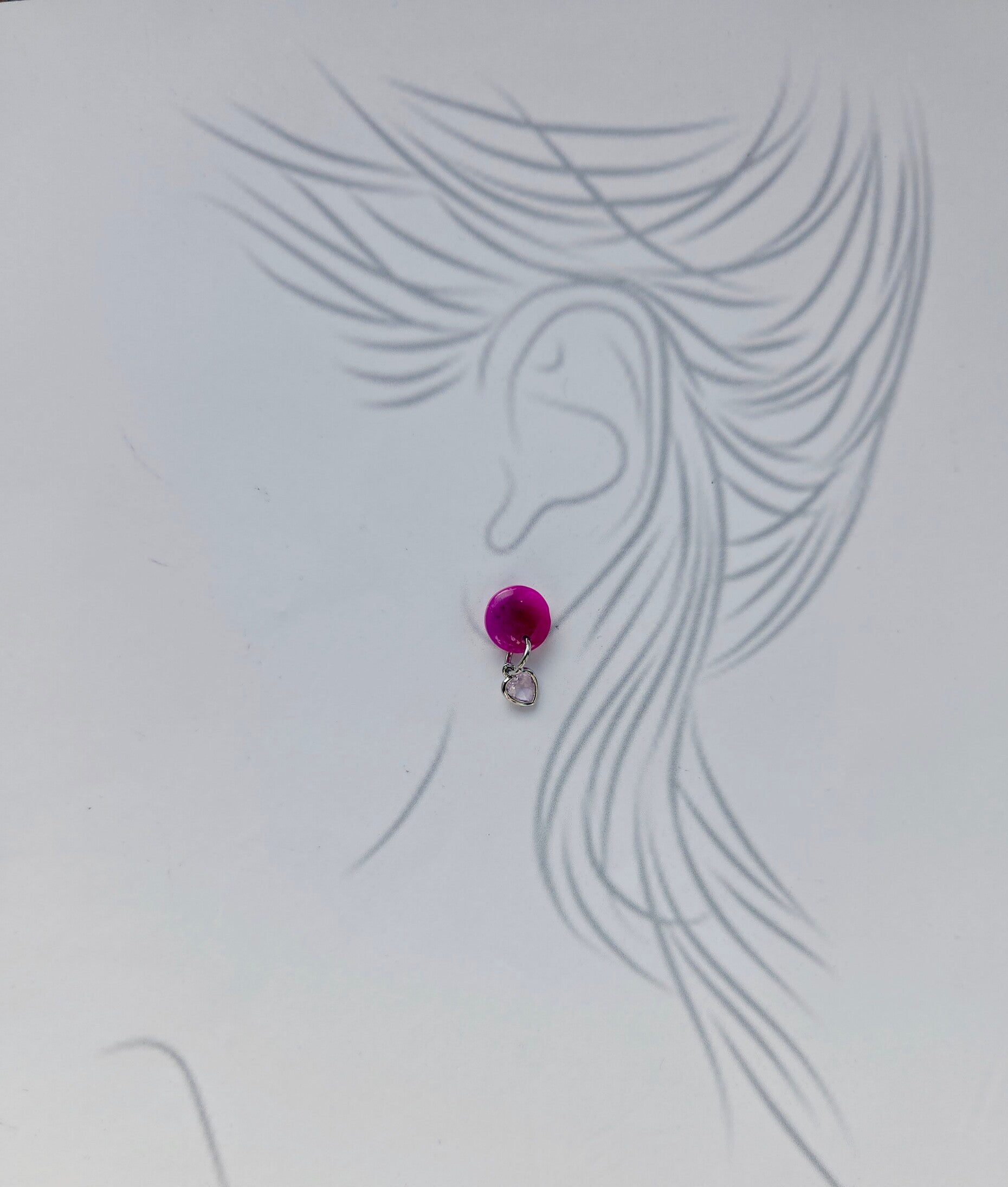 Een uniek gemengde kleur van roze en paars met een zilverkleurige hartjesbedel, wat het echt een originele oorbel maakt!