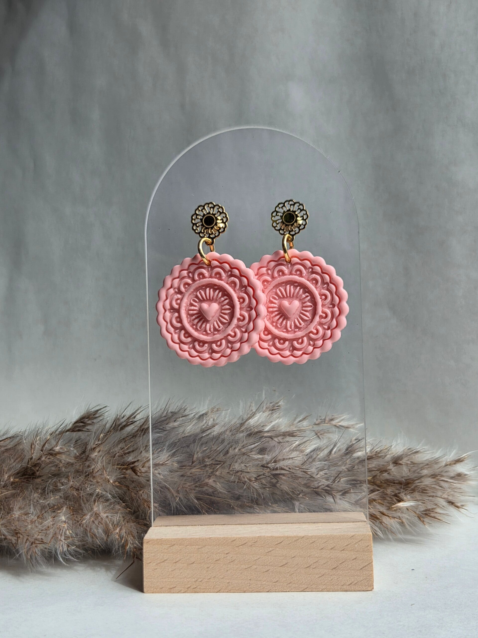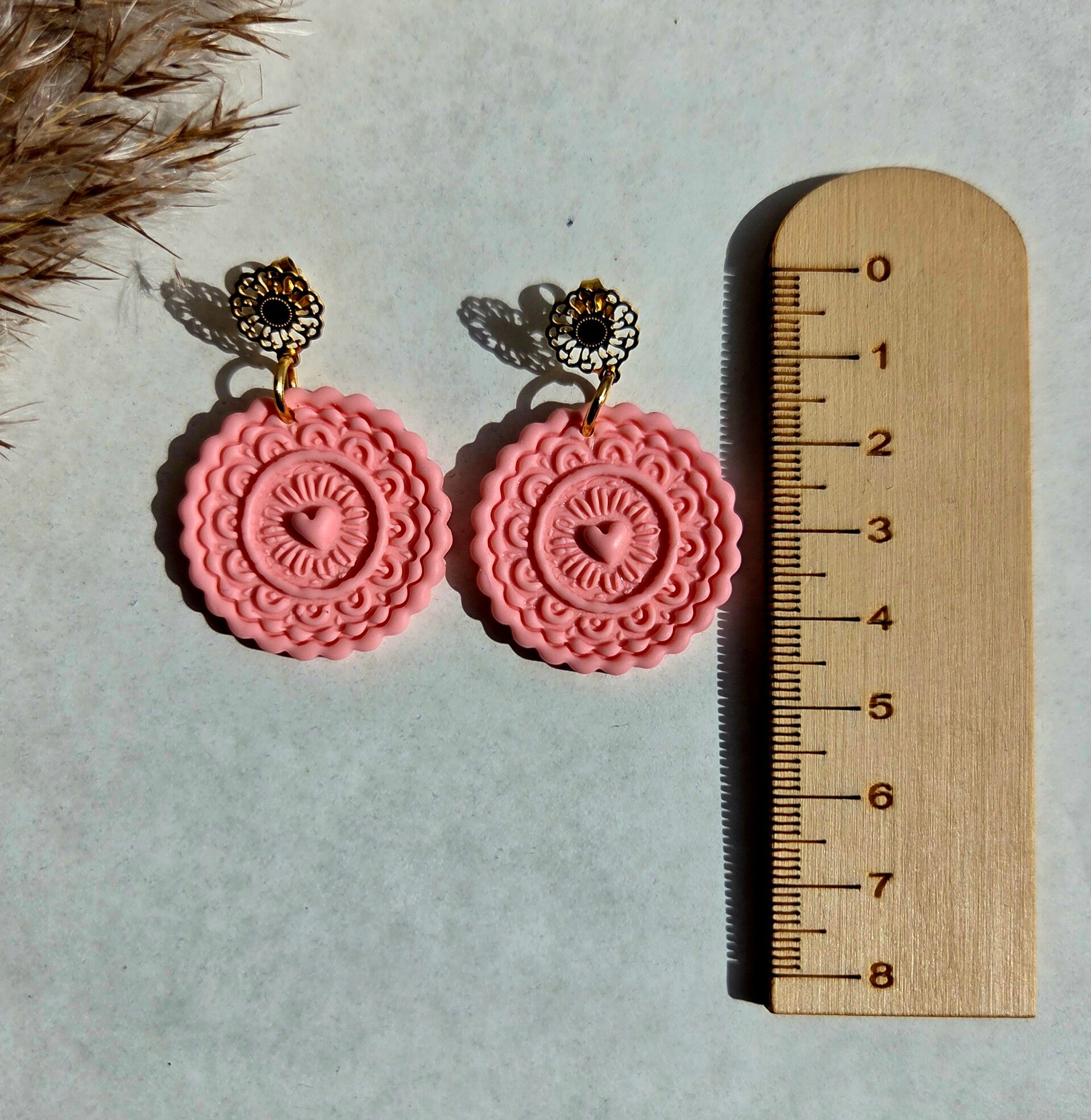 Sierlijk, vrouwelijk en vol details, maar toch eenvoudig door de zachte kleur. De polymeerklei is mat afgelakt en heeft aan de achterzijde een resin laag ter versterking. Met goudkleurige knopjes die geschikt zijn voor gevoelige oren!