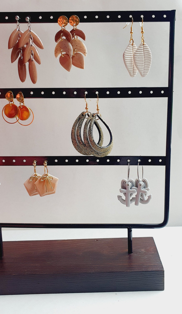 Zwart metalen rek met donkerbruin/zwart geverfd houten voet.